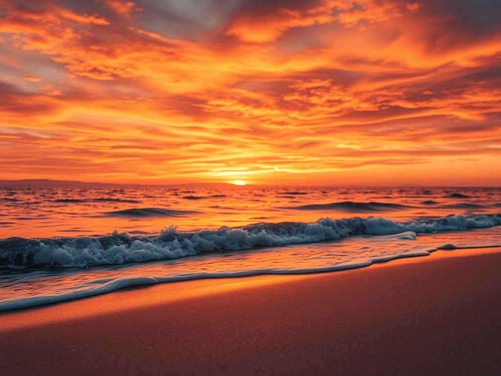 The sun dipped below the horizon, painting the sky with strokes of orange and crimson, while the scent of salt lingered in the breeze and the waves whispered secrets against the shore.