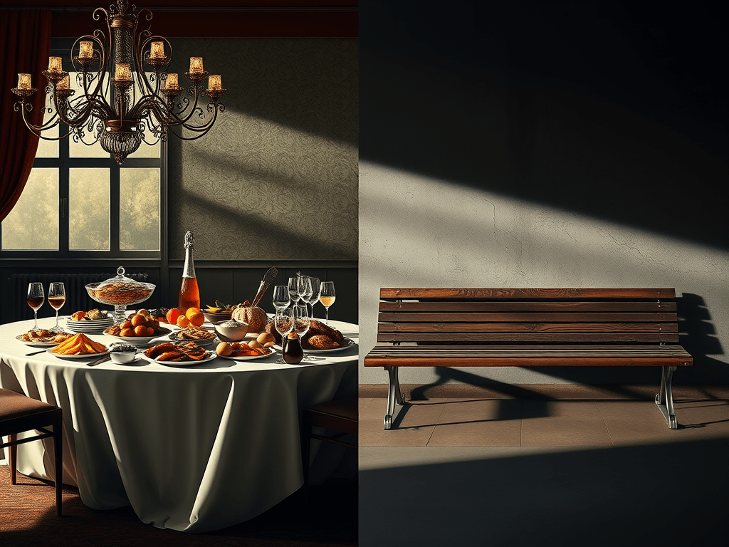 A wealthy man dining in luxury while a homeless person begs outside the window.